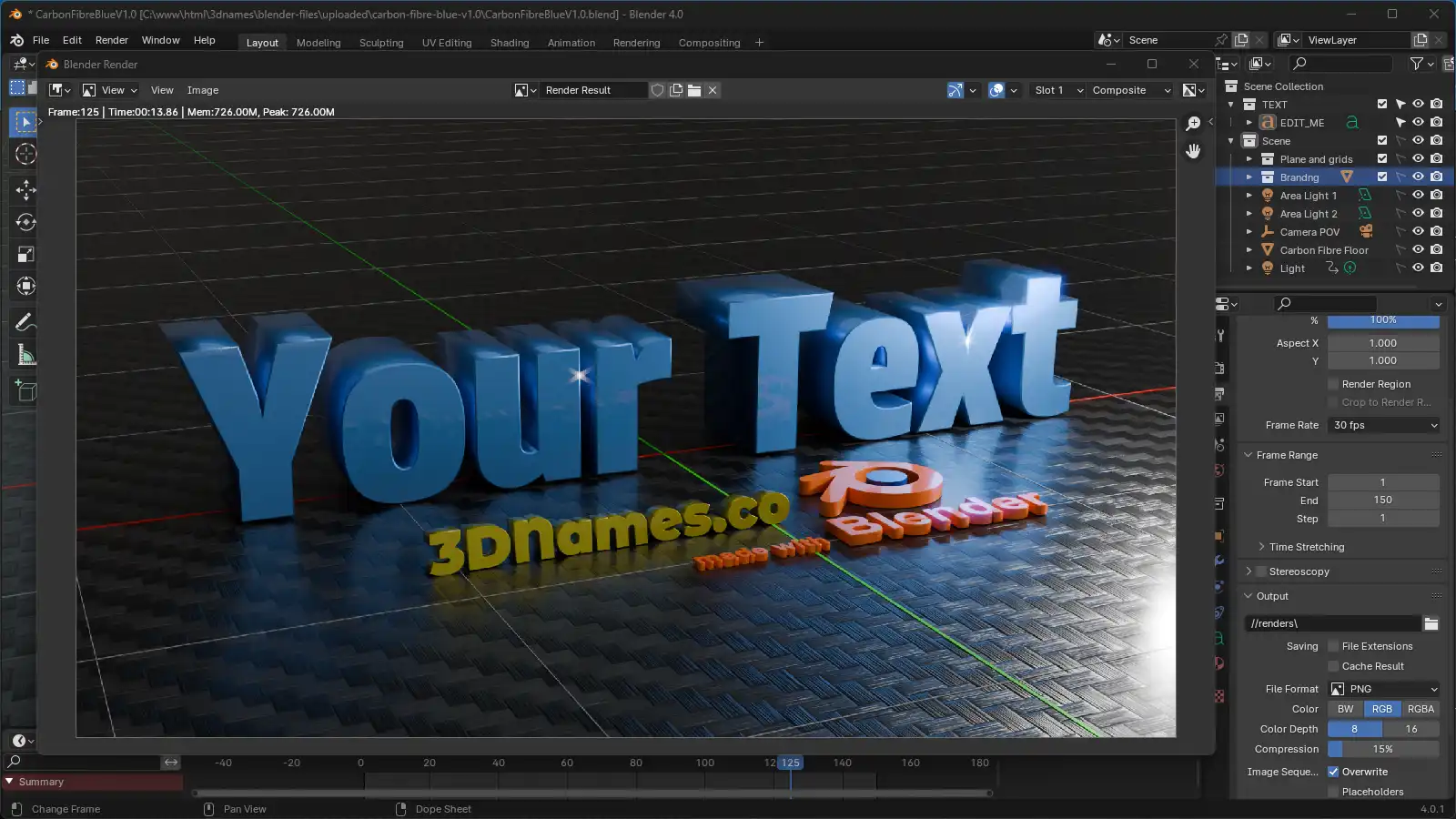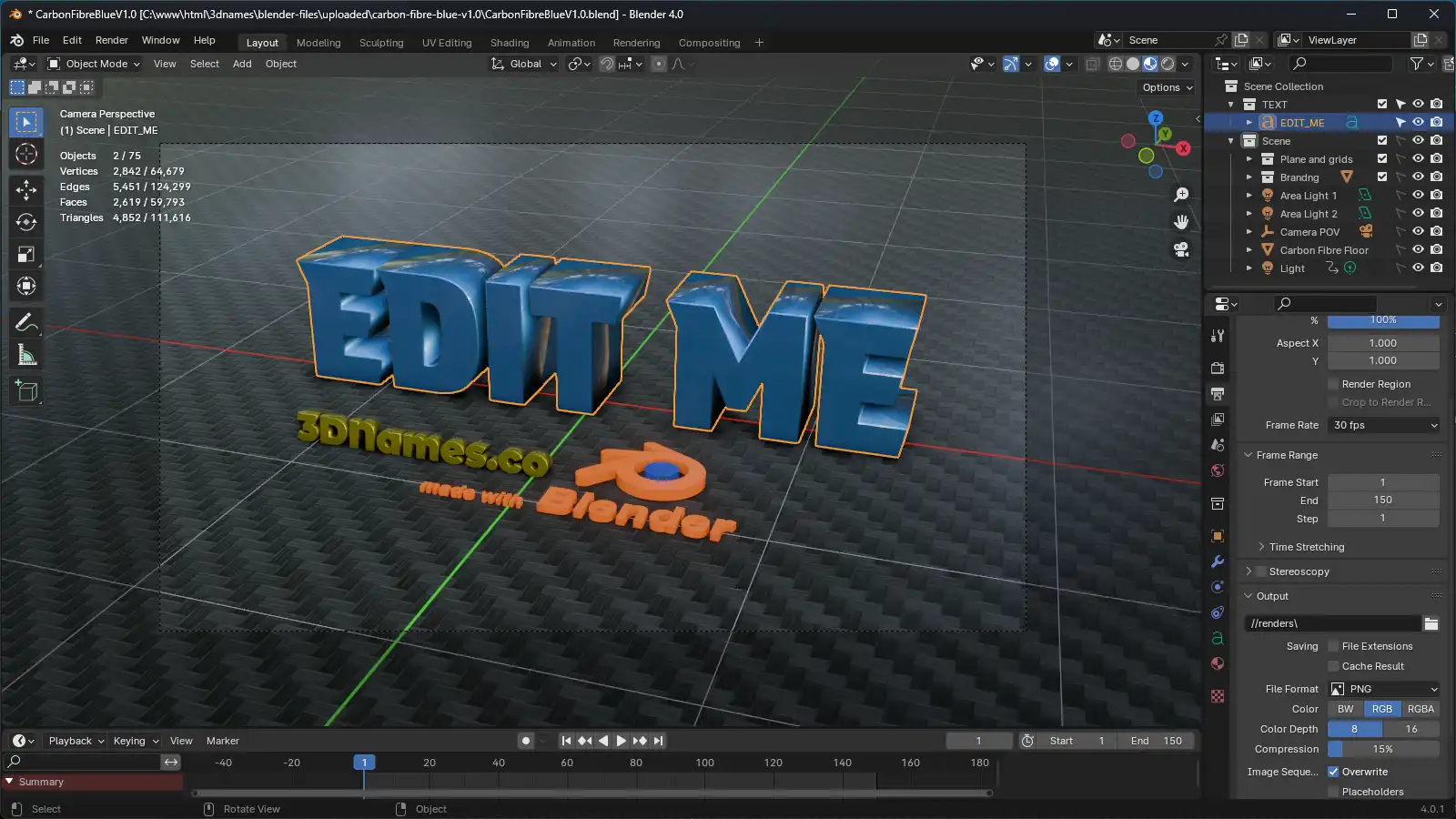 Download the ZIP file, extract it somewhere, and open the CarbonFibreBlueV1.0.blend file in Blender. We recommend using version Blender 4.0.1 or higher.